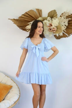 The ‘Adalyn Dress’ is such a beautiful piece to add to your wardrobe this season. We’re in love with this midi dress perfect for a casual brunch but can be dressed up for a special event too! Features beautiful elasticated puff sleeves which can be worn on or off shoulder, a front bow tie and shirred bodice. Mid length with a tire at the bottom.