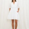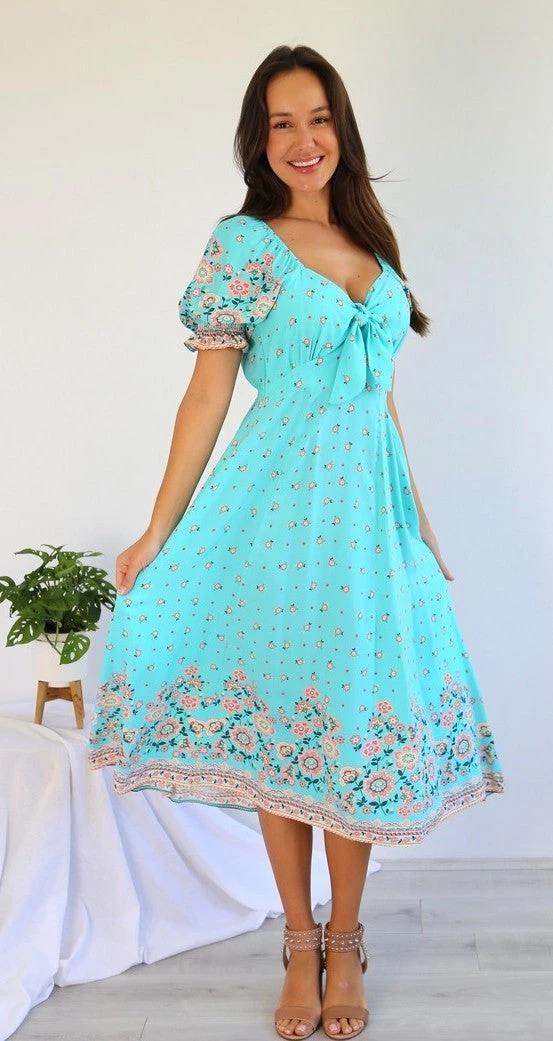 The ‘Avery Tie Dress’ features a gorgeous mint colour, perfect as a slip on, during the summer and spring season! It has a front tie, sweetheart neckline, subtle short balloon sleeves, a midi length with aline skirt.