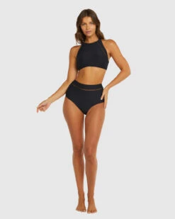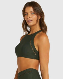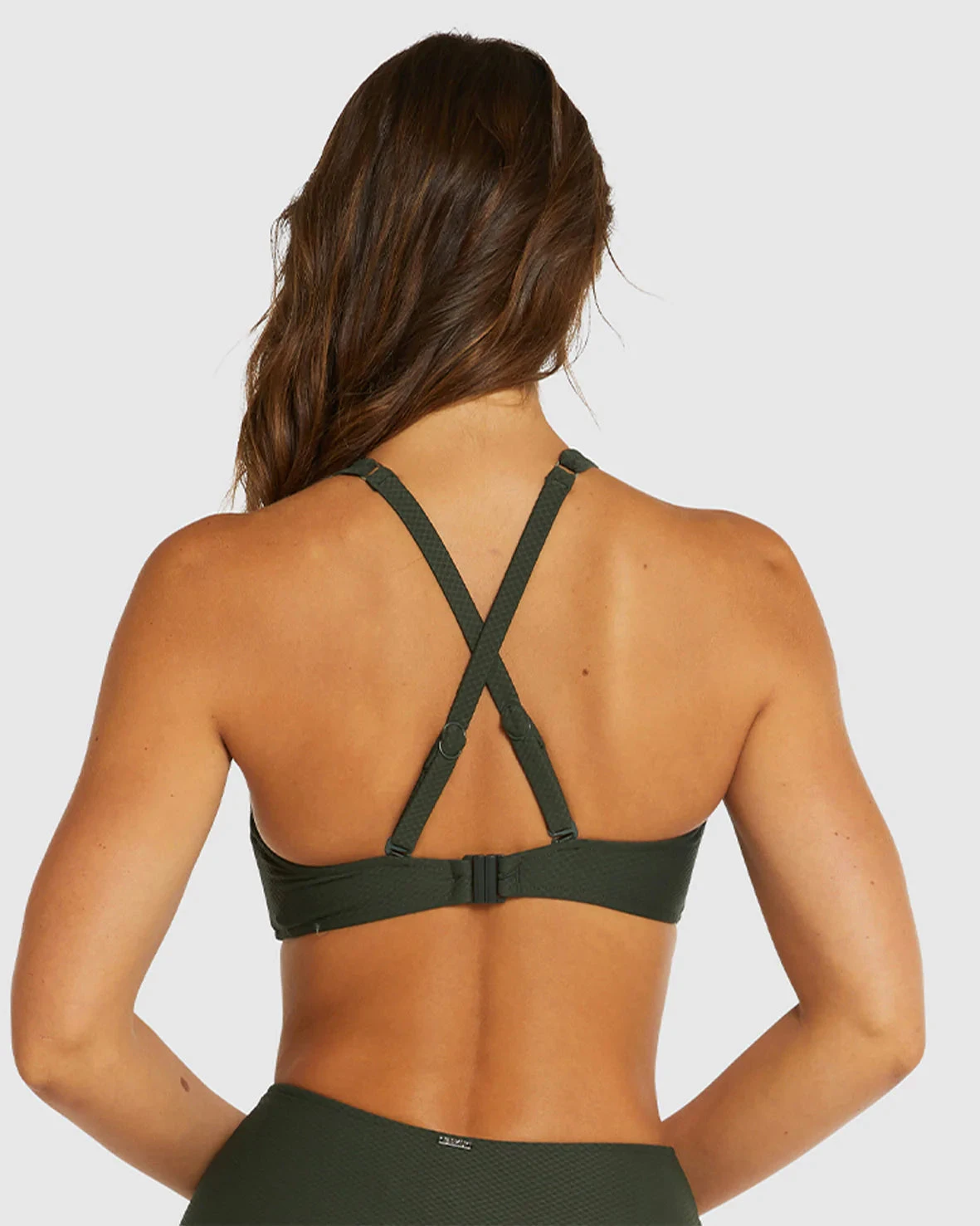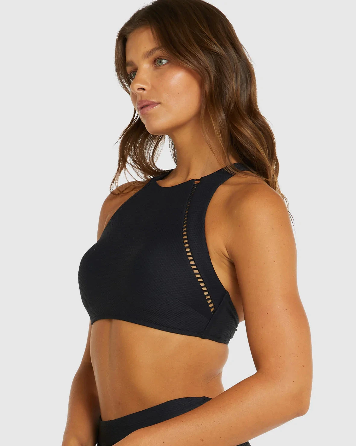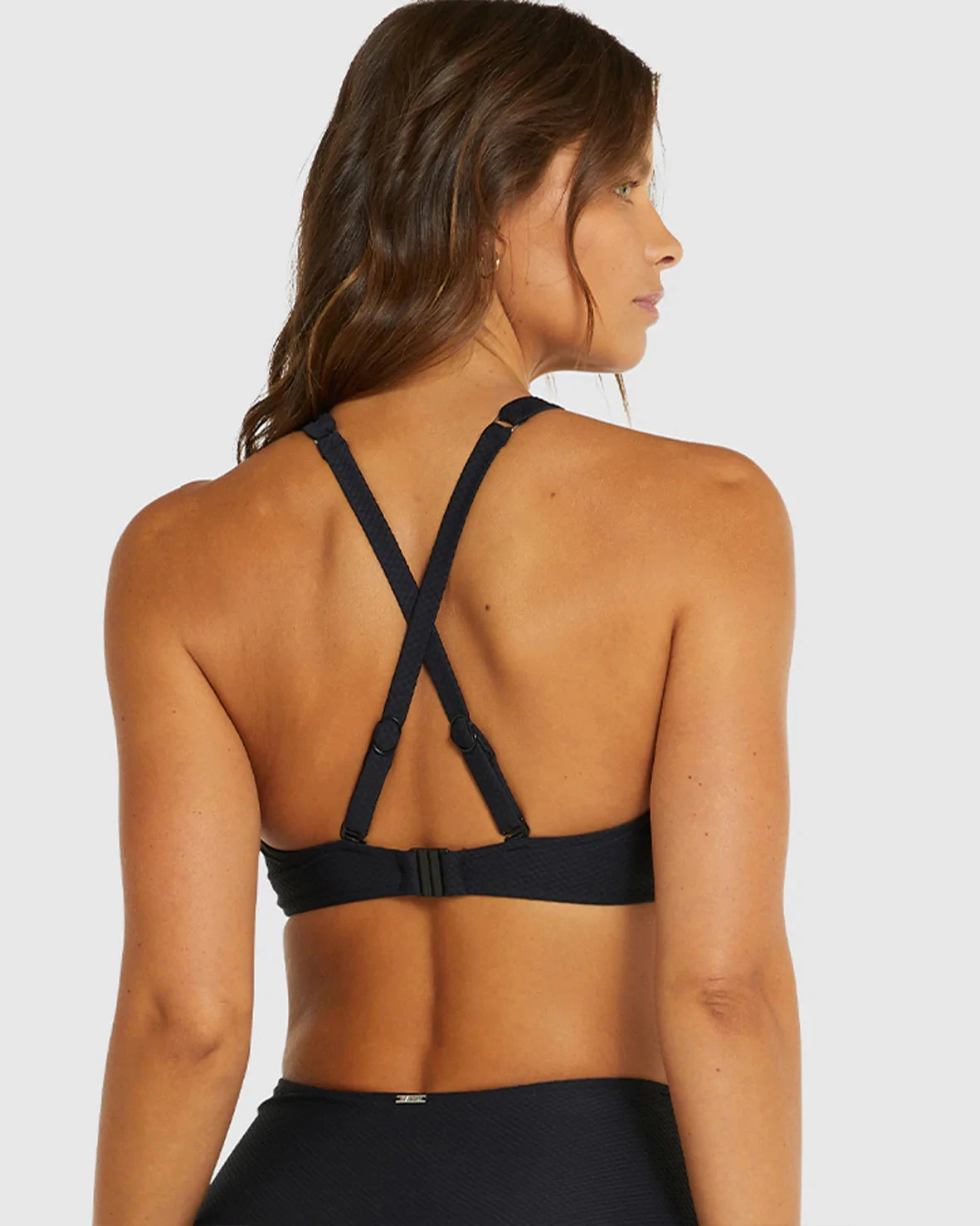 Baku’s Rococco High Neck Bra Bikini Top features a flattering high neck line with ladder lace detailing. It also features removable cups, adjustable and convertible straps. Rococco is a luxury textural fabrication from Spain that is buttery soft, yet sophisticated and structured.