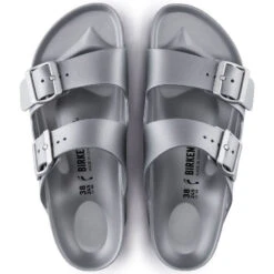 These Birkenstock Arizona EVA Metallic Silver two-strap sandals are made of 100% EVA meaning they are weightproof, lightweight, flexible and shock-absorbing.