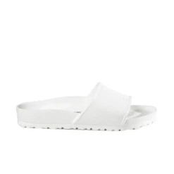The Birkenstock Barbados White EVA Regular  is a waterproof lightweight, sporty slide design with a hexagon pattern and logo lettering. Modelled on the cork sandal, this sandal is made from one piece of light, flexible and waterproof moulded EVA.