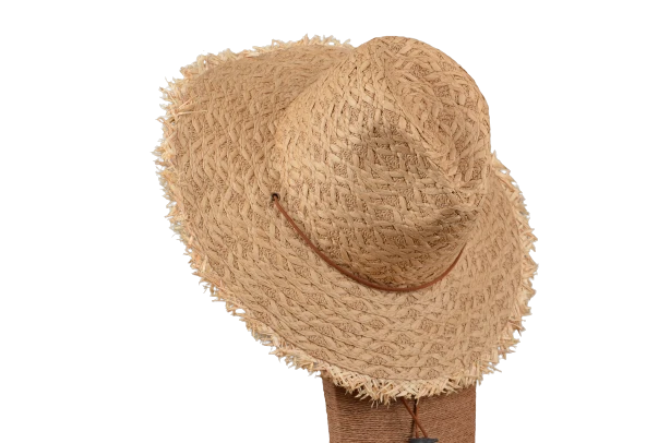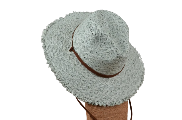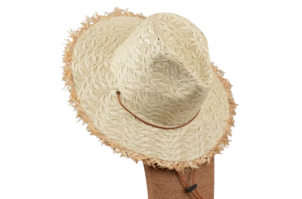 Frayed Edge Wide Brim Hat. Wide brim for great sun protection. Frayed edging detail. Small band with tightens to chin. Â