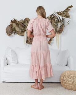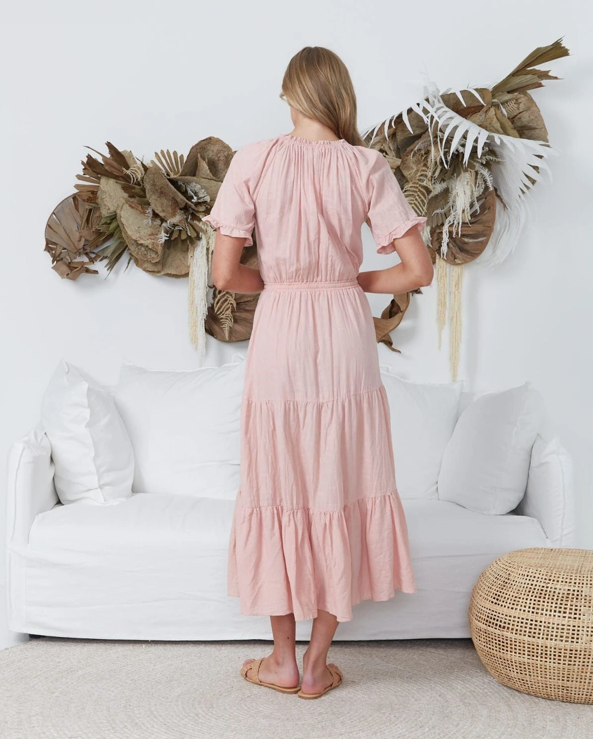 A lovely light pink flowy dress. Made from cotton and below knee length this dress is perfect for any occasion. Front buttons with an elastic waist and drawstring to give you a nice hour glass shape.