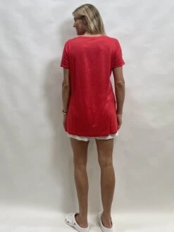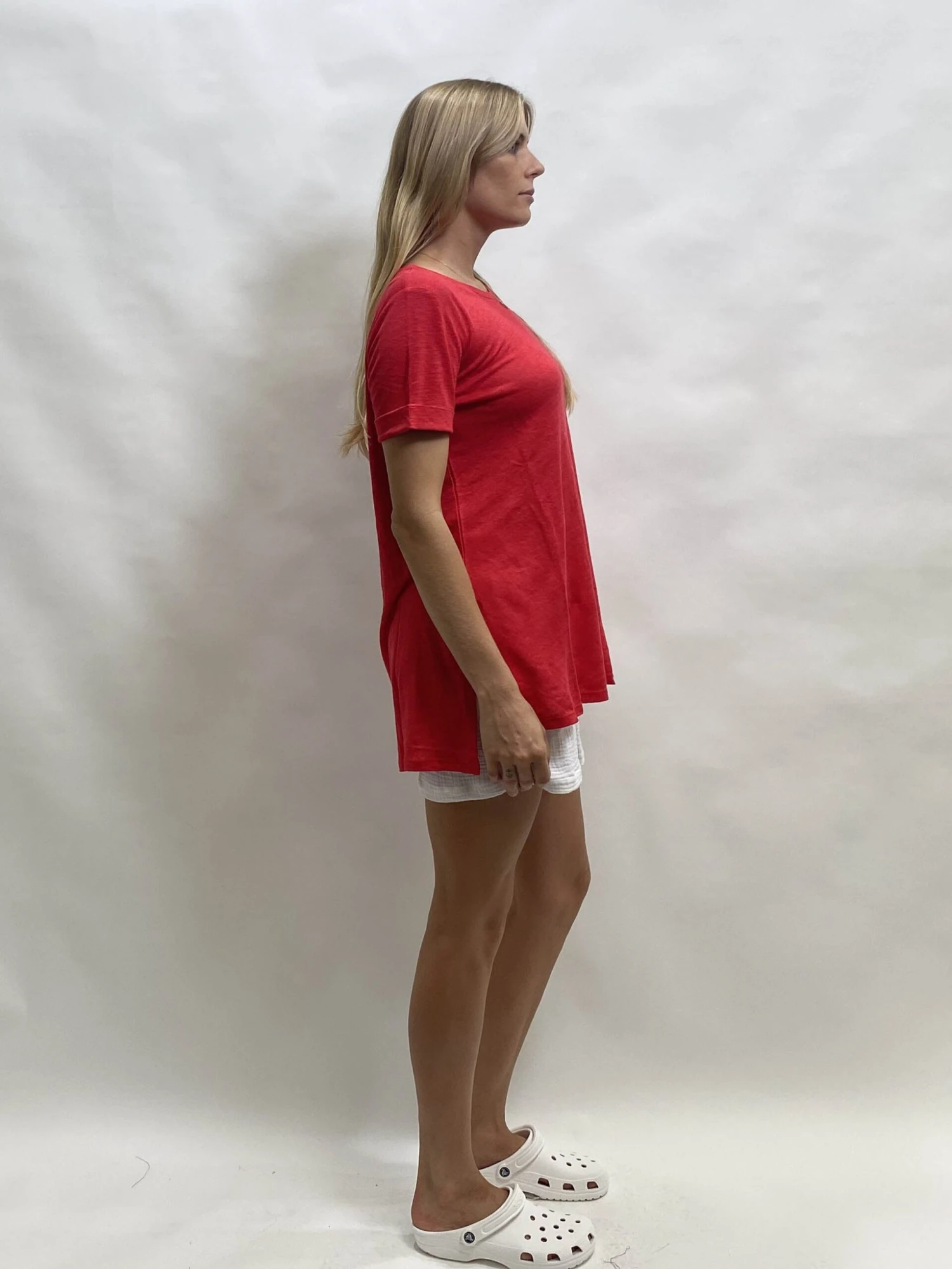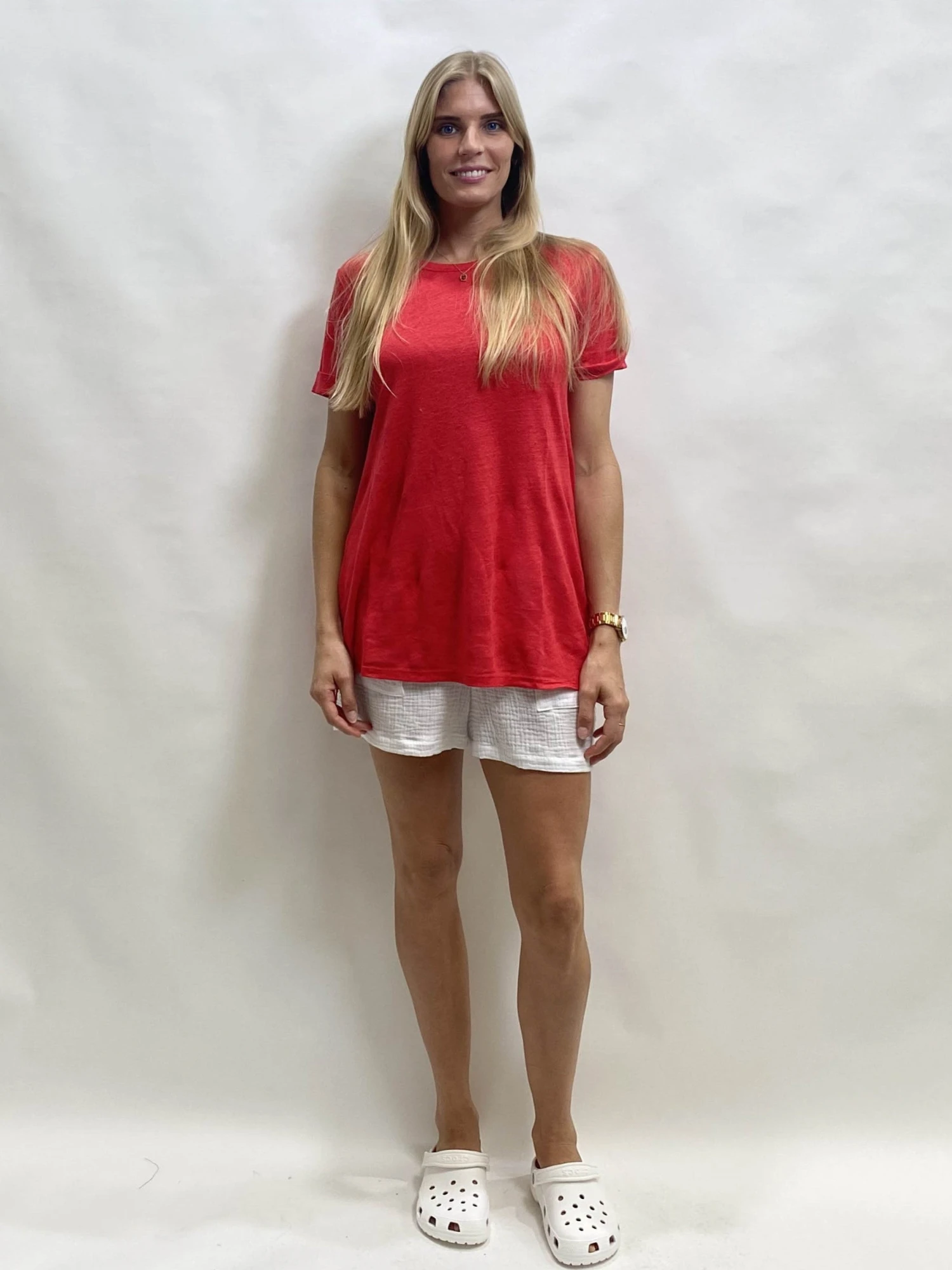 A timeless cool tee-shirt in a soft pure linen. Slightly oversized and comfy, this Linen Round Neck T-Shirt is versatile. It features round collar and rounded hemline. Comfortable and easy to style, it looks especially cool with the front tucked into jeans or loose over shorts as pictured.