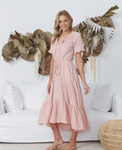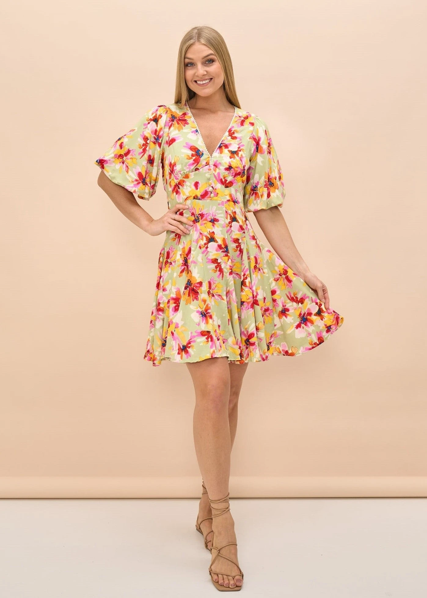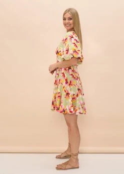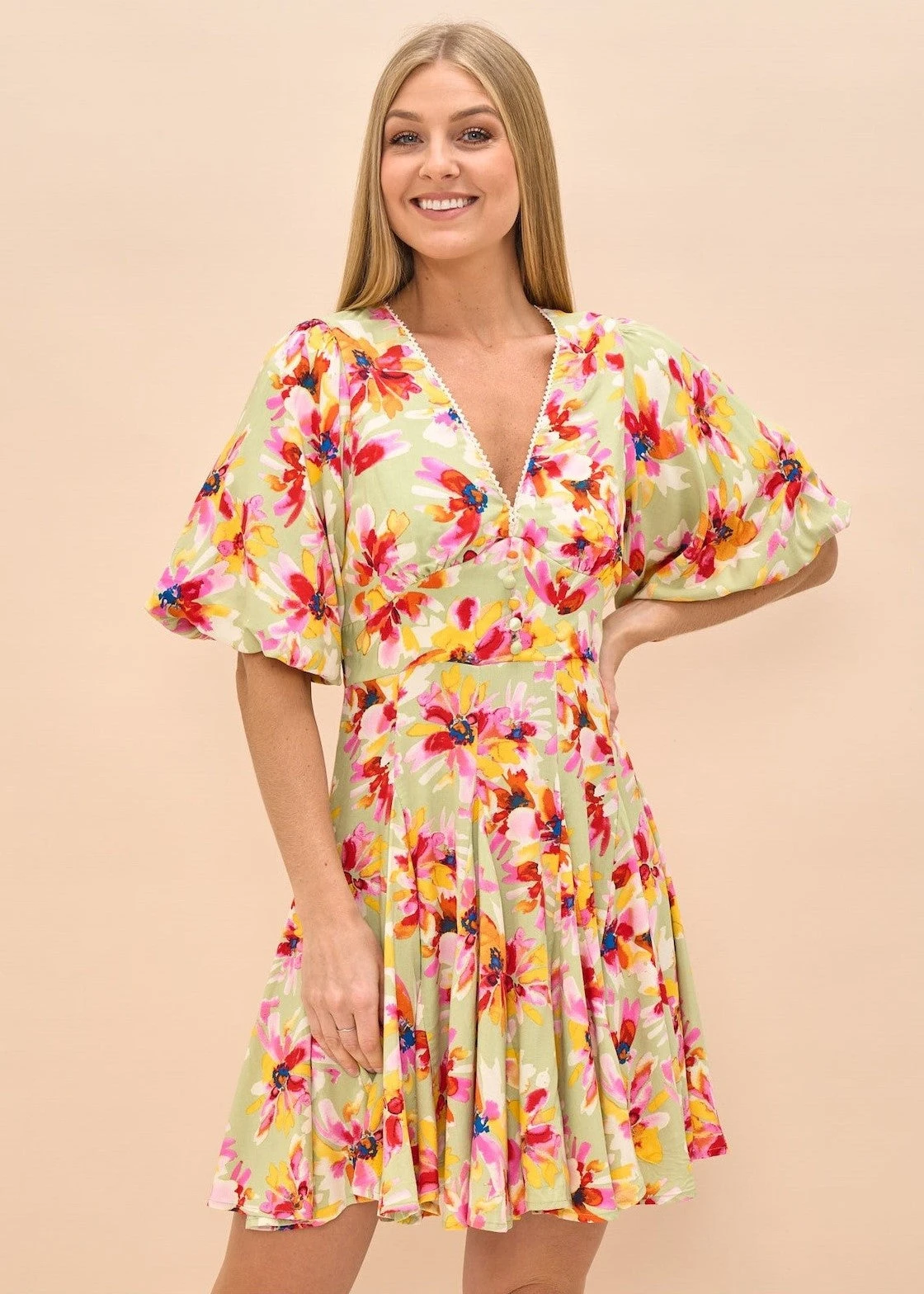 Our Missy V Neck floral dress is a stand the perfect summer date dress. With a V-neckline, flowy sleeves, front bottoms and a nice shaped waist line . This will be your go to dress this summer.Â