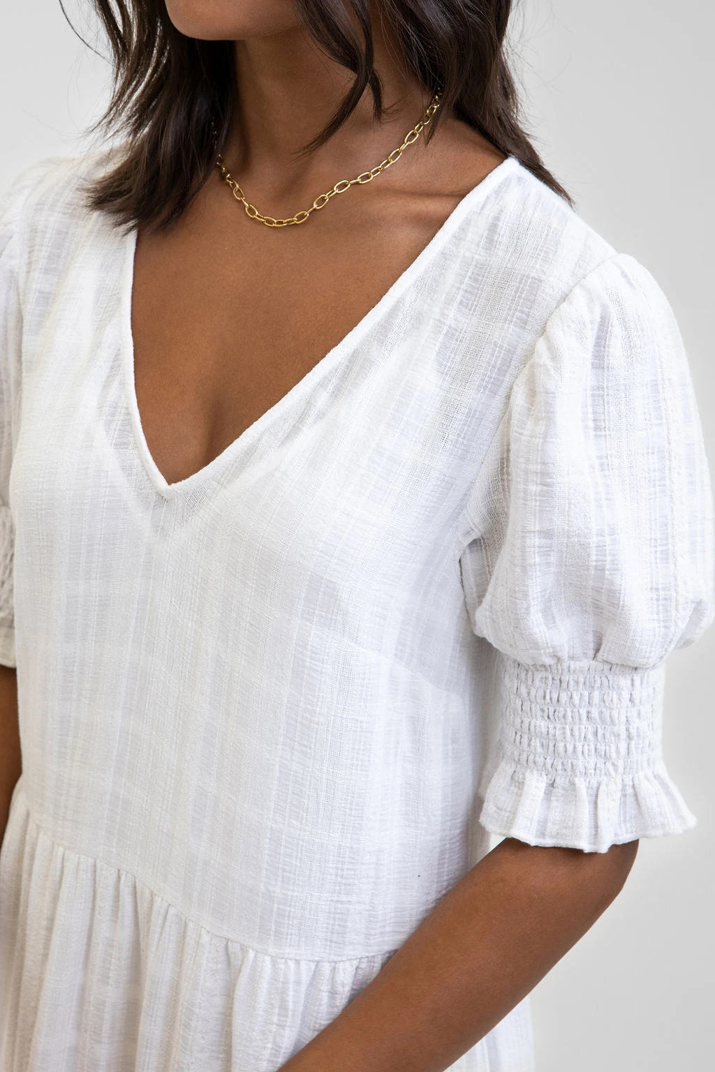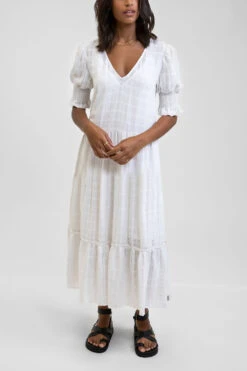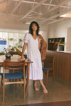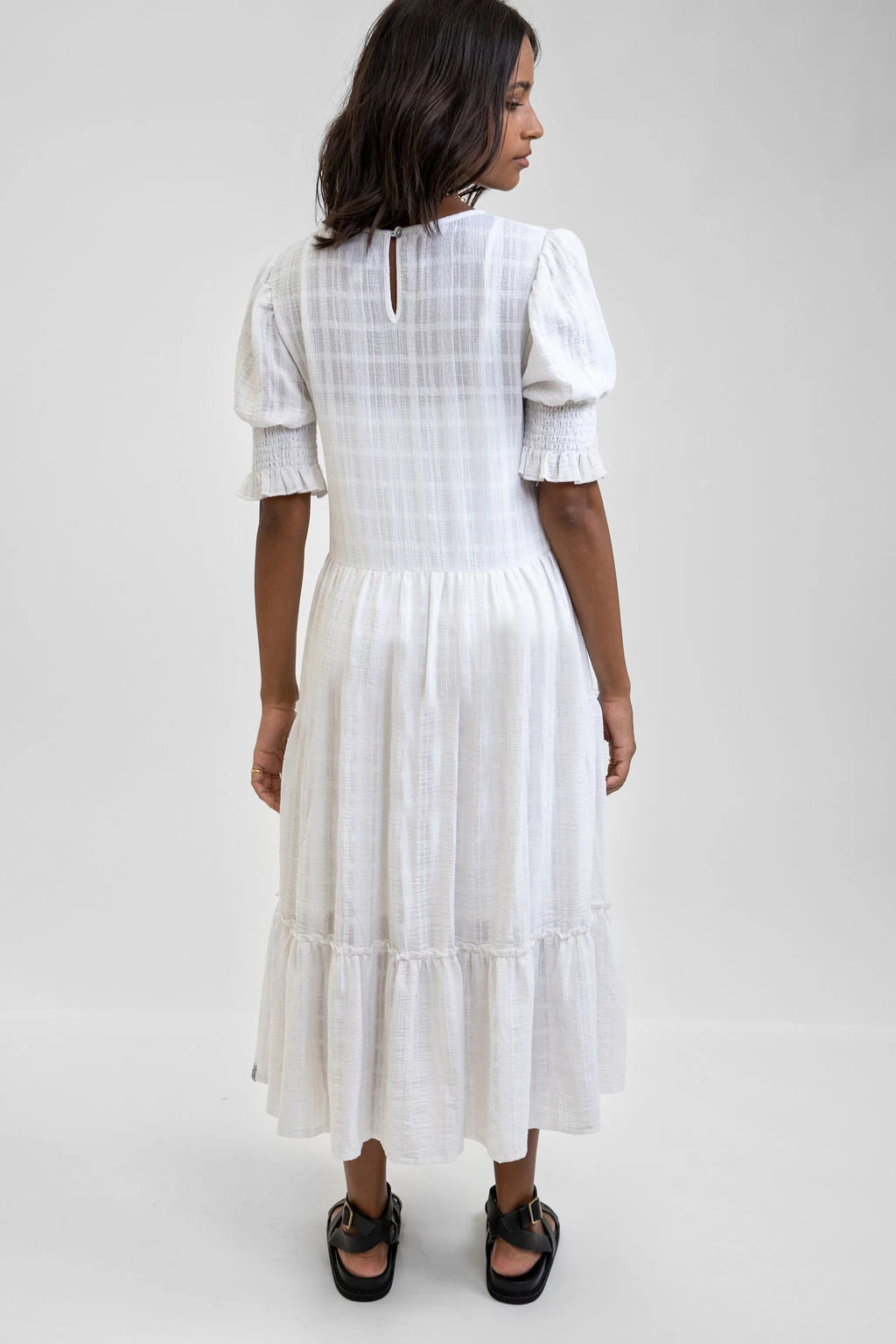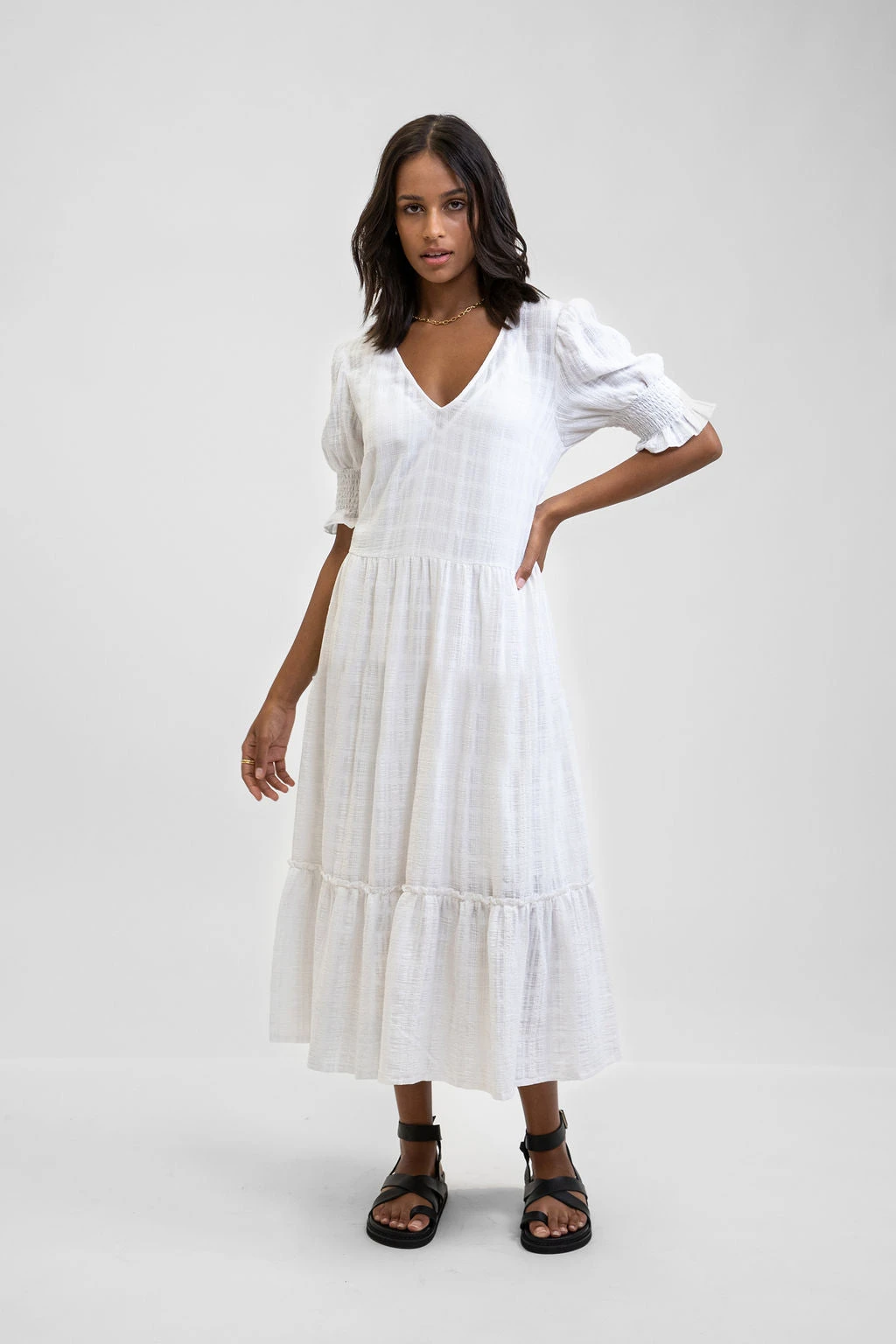 The Chloe Tiered Maxi Dress in 100% textured weave cotton will have you wandering in and out of daydreams. Featuring puff sleeves, back keyhole with pearl button and a removable dress lining, itβs the ultimate ode to the sun.
