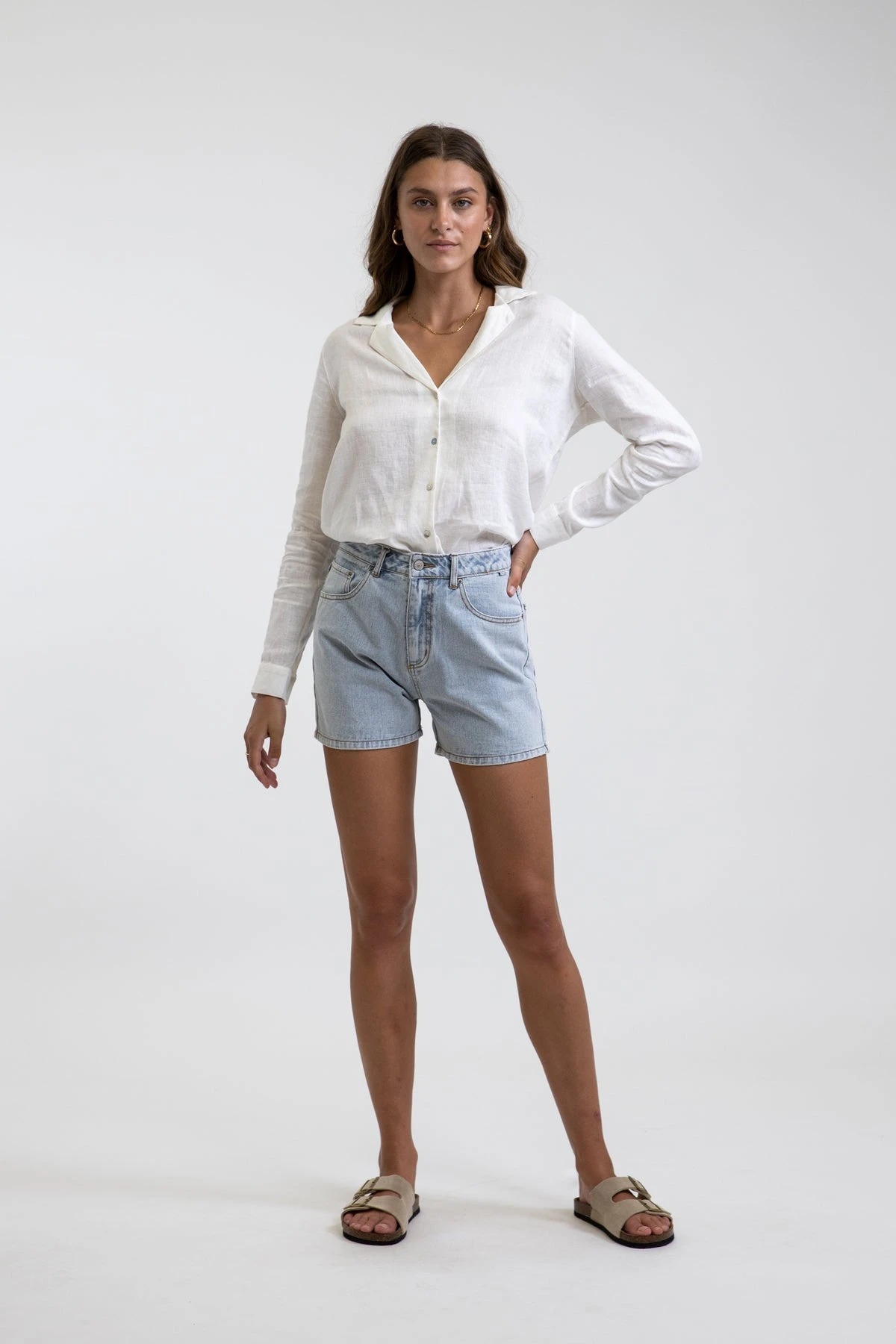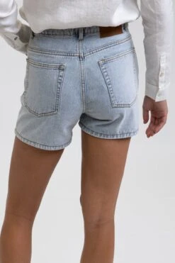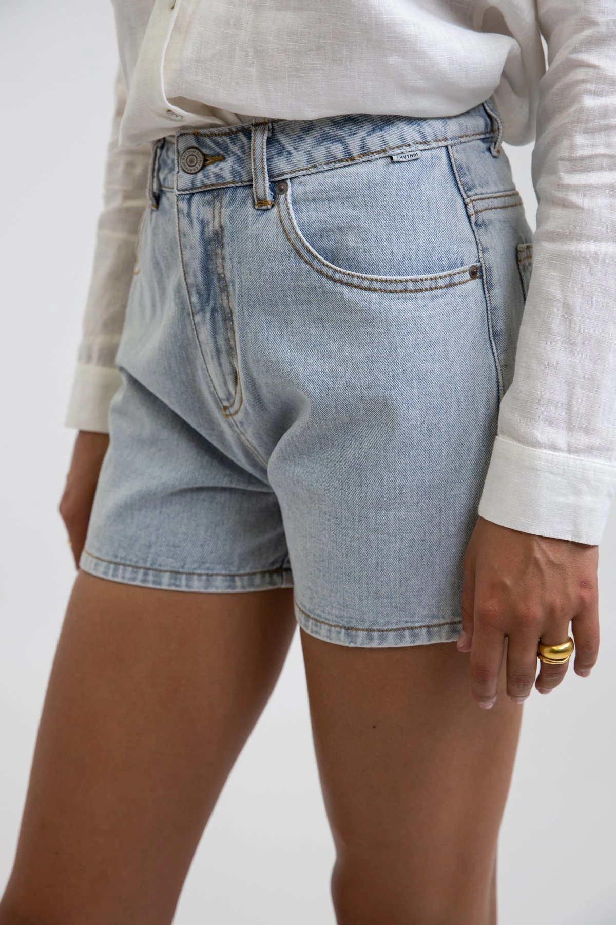 Crafted in heavy duty 12.6oz classic denim, the Classic A-line Short in a classic washed denim will complement any outfit for effortless warmer weather style. With metal shank buttons, heavy gauge top stitching details and a wider leg opening in a high waist, this flattering short is a wardrobe essential in a perfect tried and tested fit.