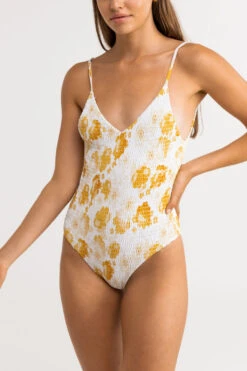 Made for dreamy days under the sun, the Harmony Smocked One Piece features a vintage inspired print in a smocked texture and features a super flattering low back detail. Designed in sun drenched yellows and crisp white, its the one piece made for long summer days by the ocean.Â