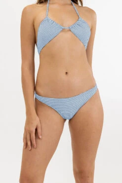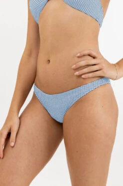 Classic low-rise bikini bottoms featured in a playful gingham print with high-cut legs and moderate bottom coverage.