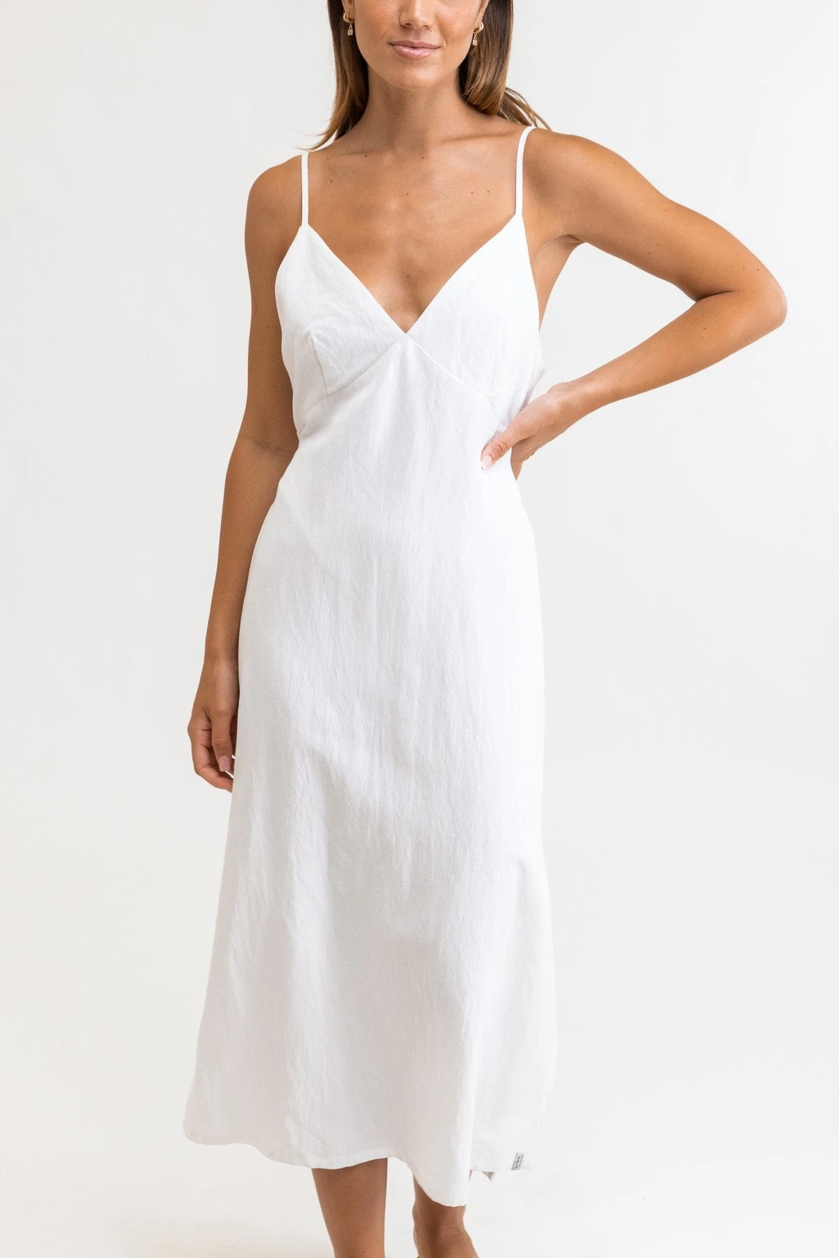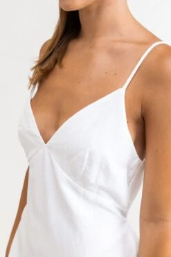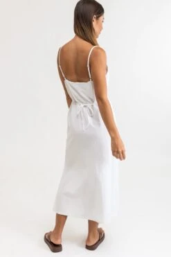 The Portofino Dress in crisp white will have you looking like a summer breeze on the Italian Riviera, with a textured cotton v front neckline and tie waist in a versatile midi length.