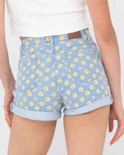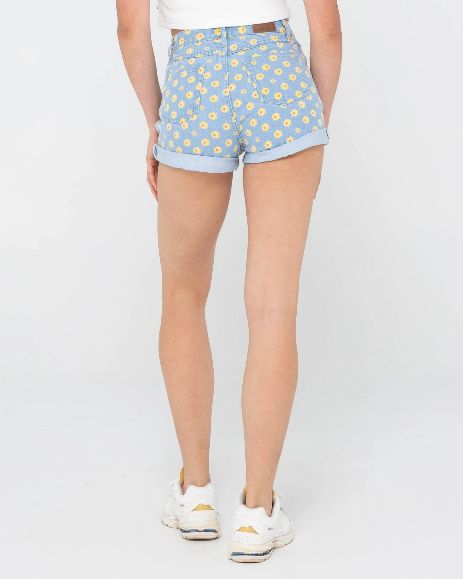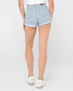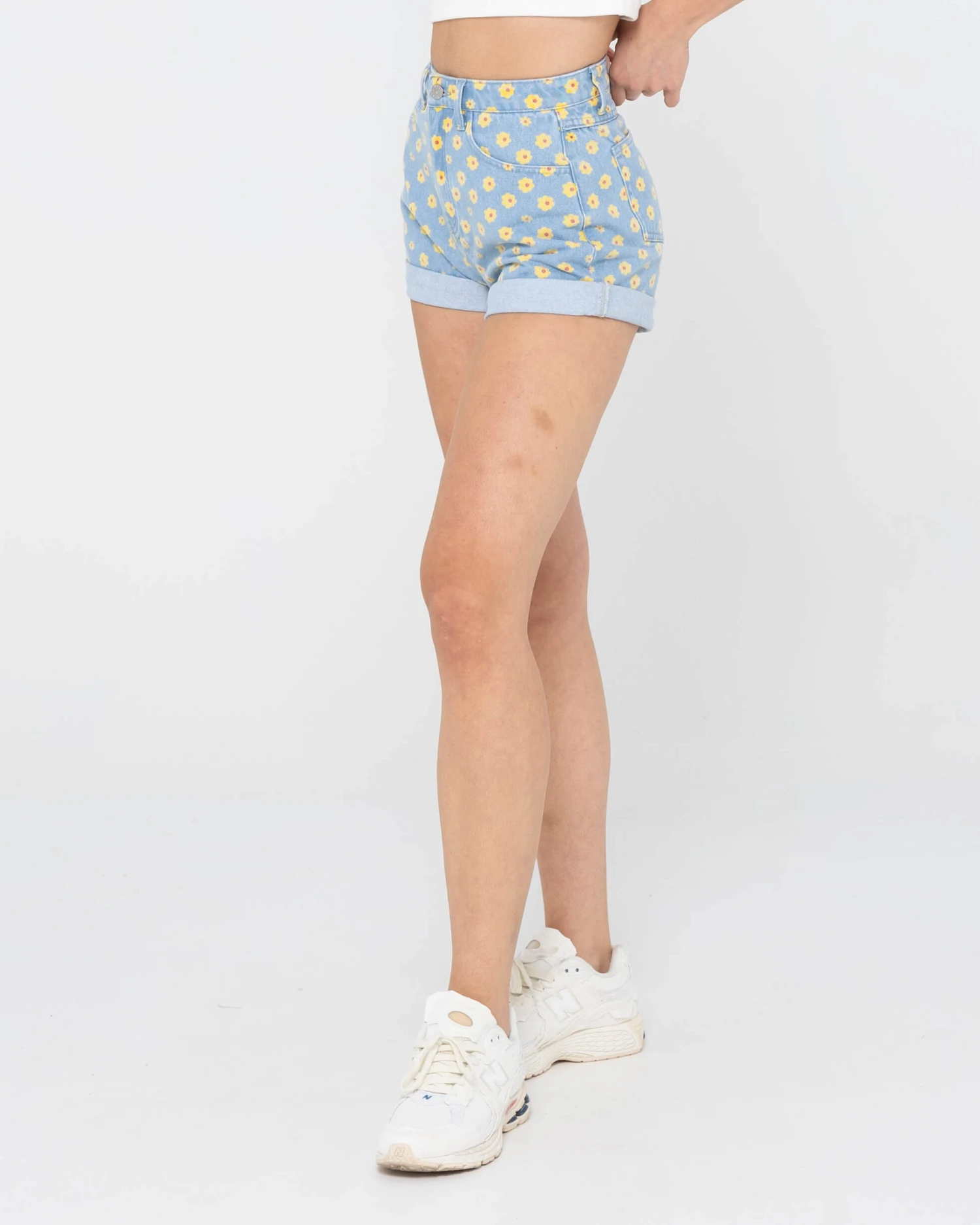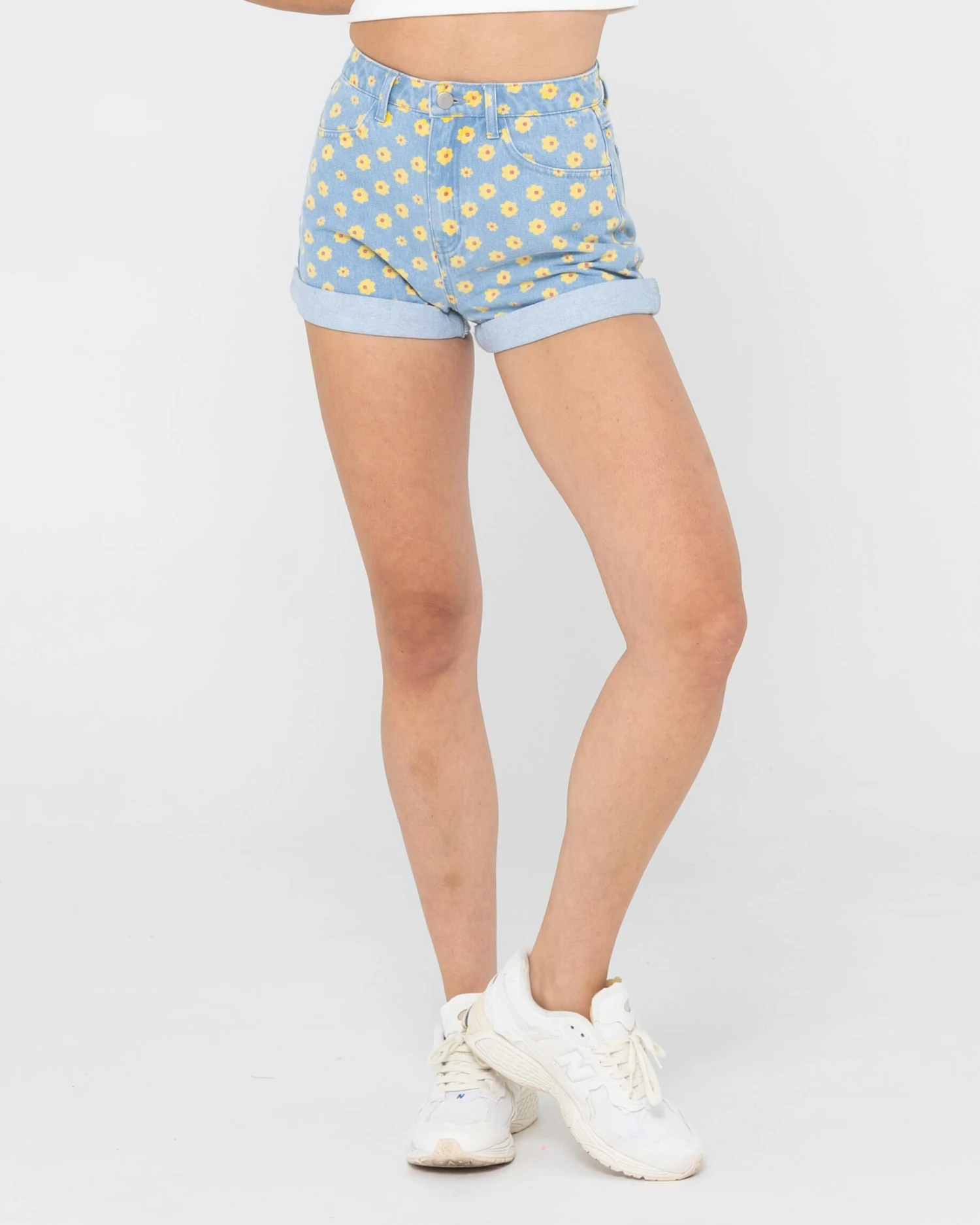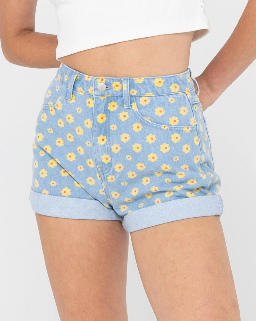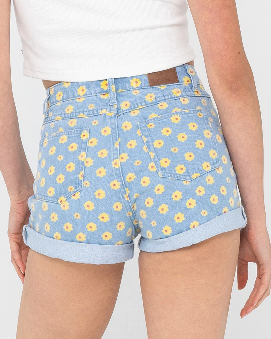 Feel fresh as a daisy for your upcoming summer adventures wearing our new Daisy denim shorts. These printed shorts feature a high waisted fit with pockets front and back, a Rusty patch logo and are rolled up at the hems.