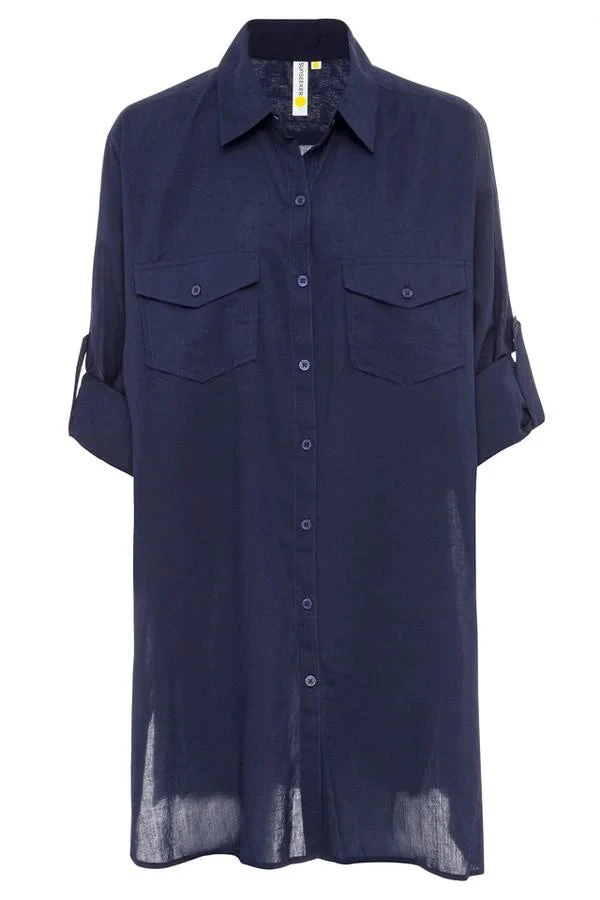 Perfect for styling over swimwear, this loose fit shirt from Sunseeker is a real wardrobe staple. Featuring button through front with relaxed box fit, collar, side splits, front pockets and long sleeves that can be rolled.Â