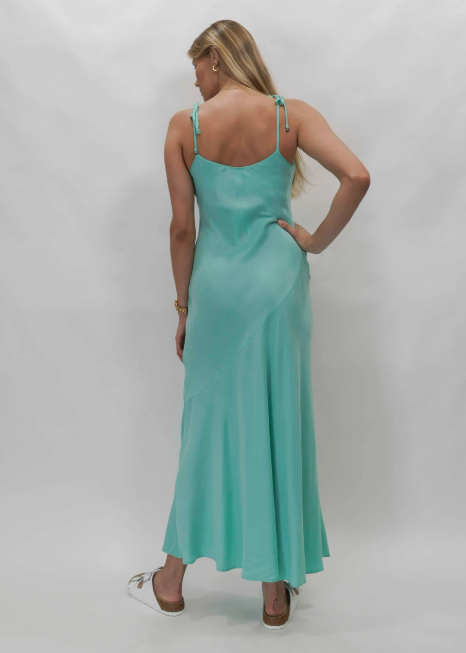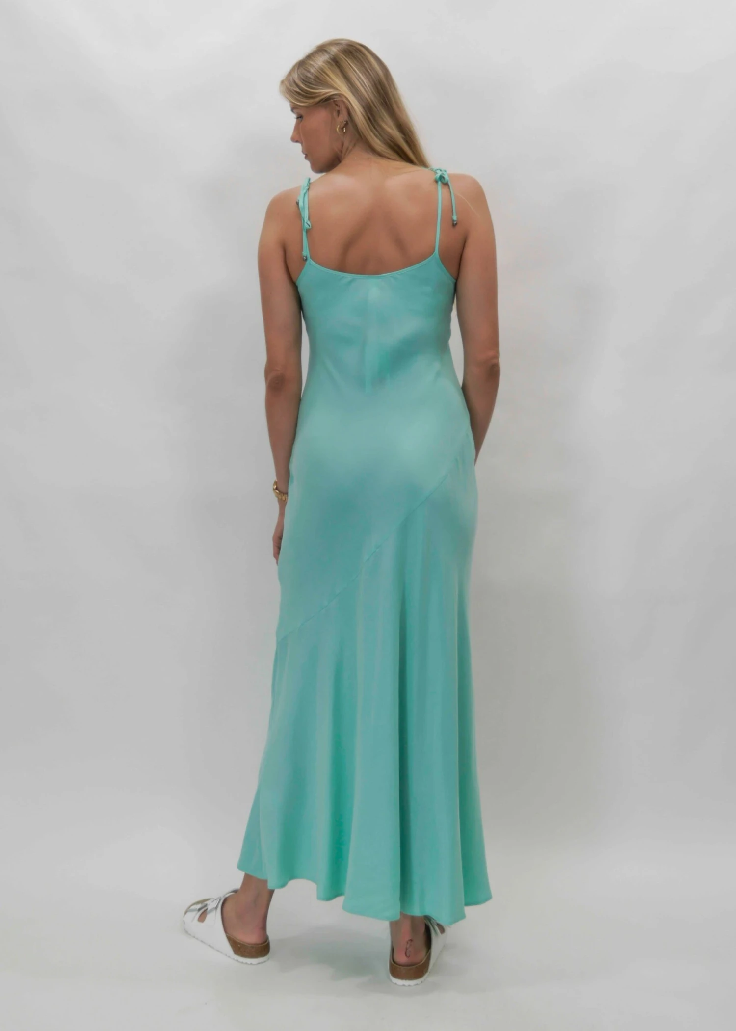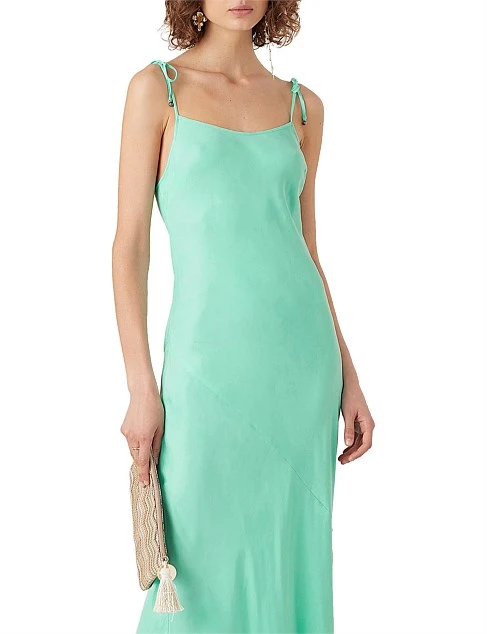 Classic bias cut maxi slip dress with soft scooped neckline and adjustable tie straps finished with charms.