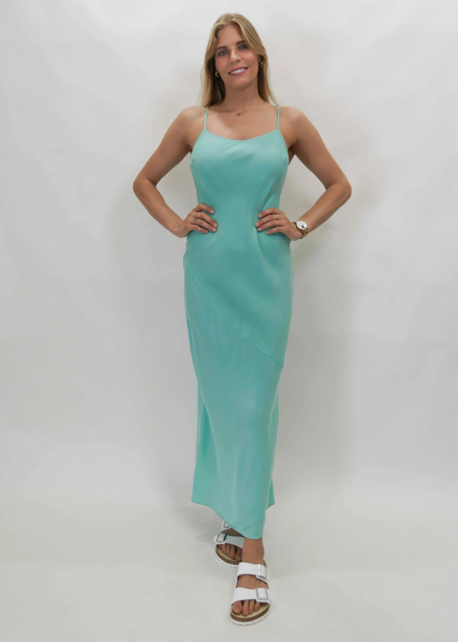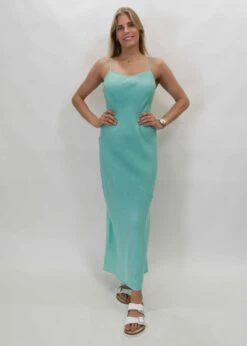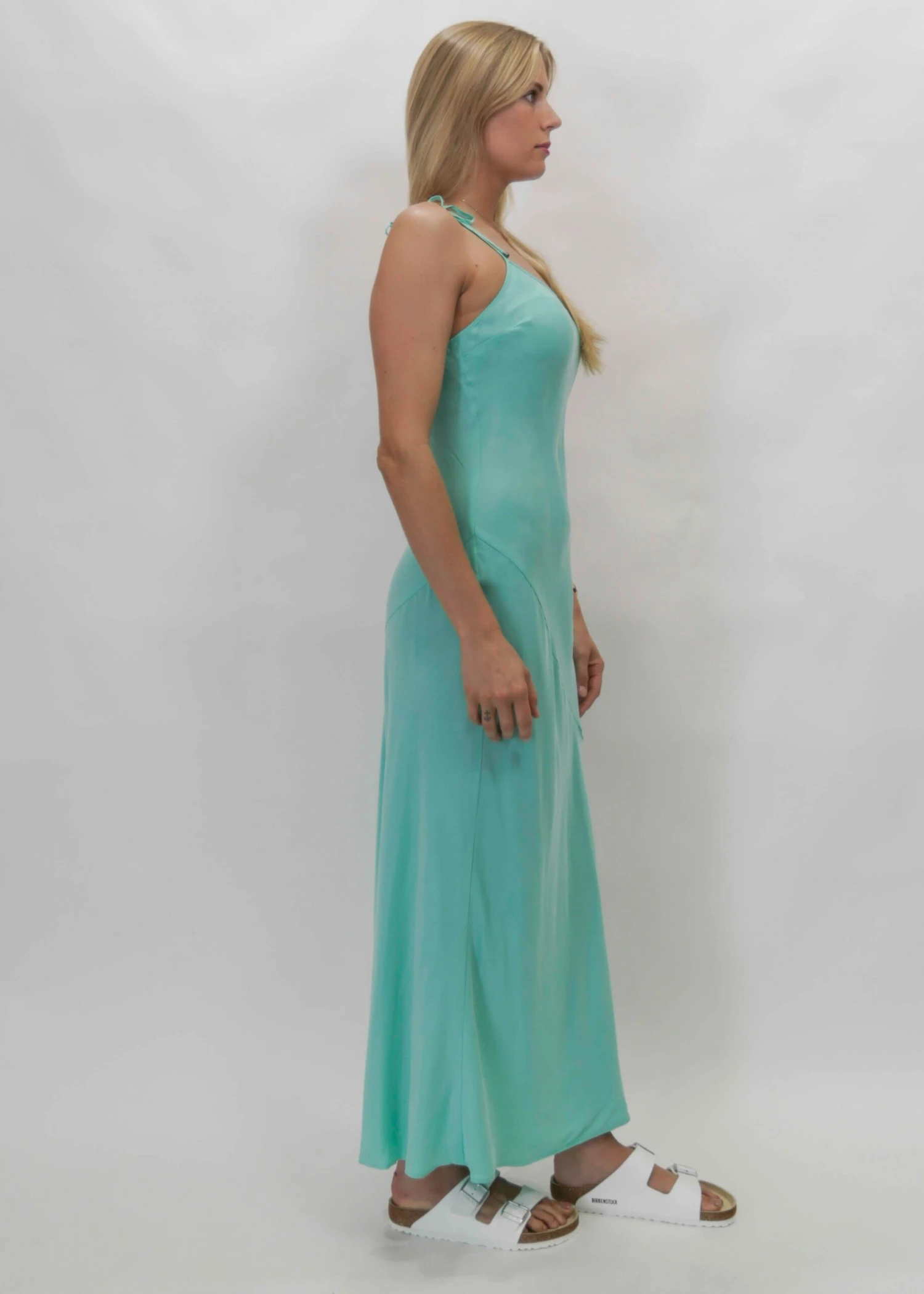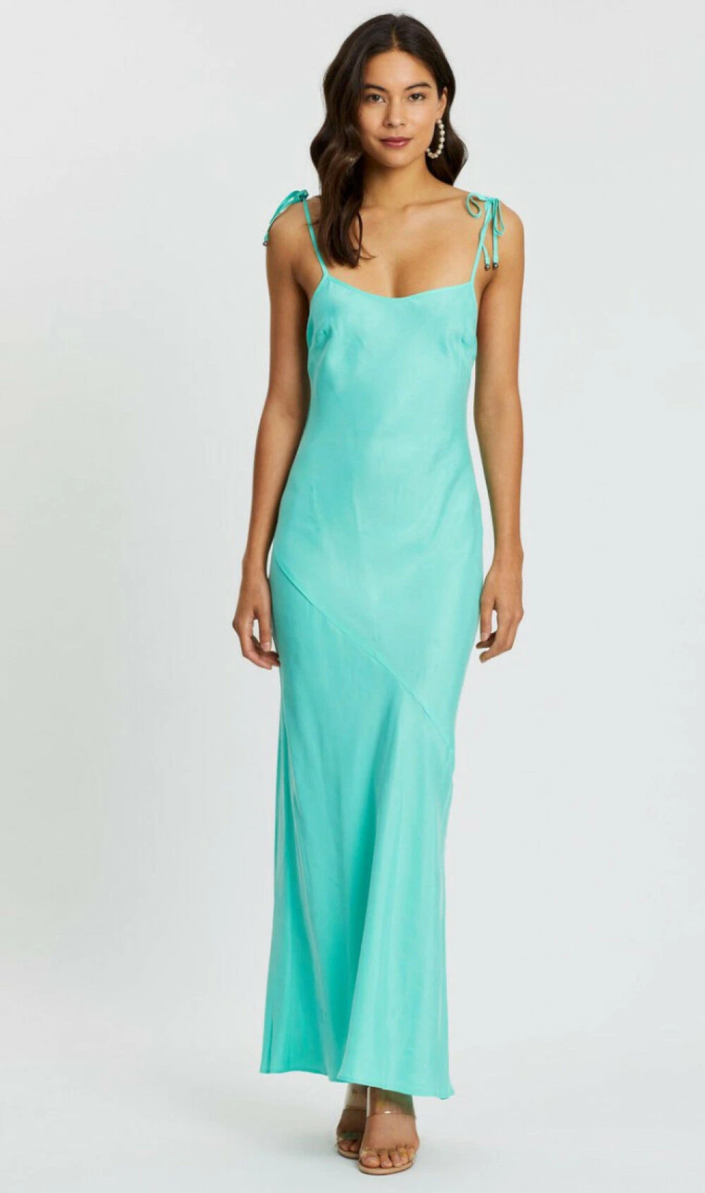 Classic bias cut maxi slip dress with soft scooped neckline and adjustable tie straps finished with charms.