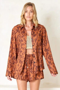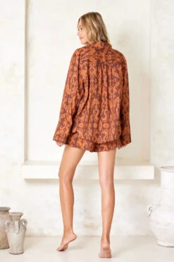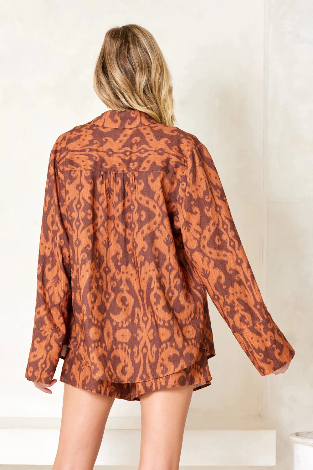 Inspired by traditional Ikat weaving, Kiriana embodies our love for the ocean with its rich blues and greens. From tones found in crashing waves to the sandy shores, explore Kiriana in all new reversible swim and dramatic apparel silhouettes. Our newest shirt, Kiki is a relaxed style shirt that’s perfect as an overswim piece. Featuring a left chest pocket, cuffed sleeves and slight gathering at back, Kiki is a relaxed style to add to your essential wardrobe pieces.
