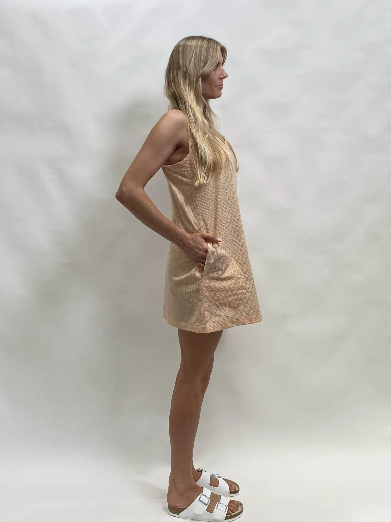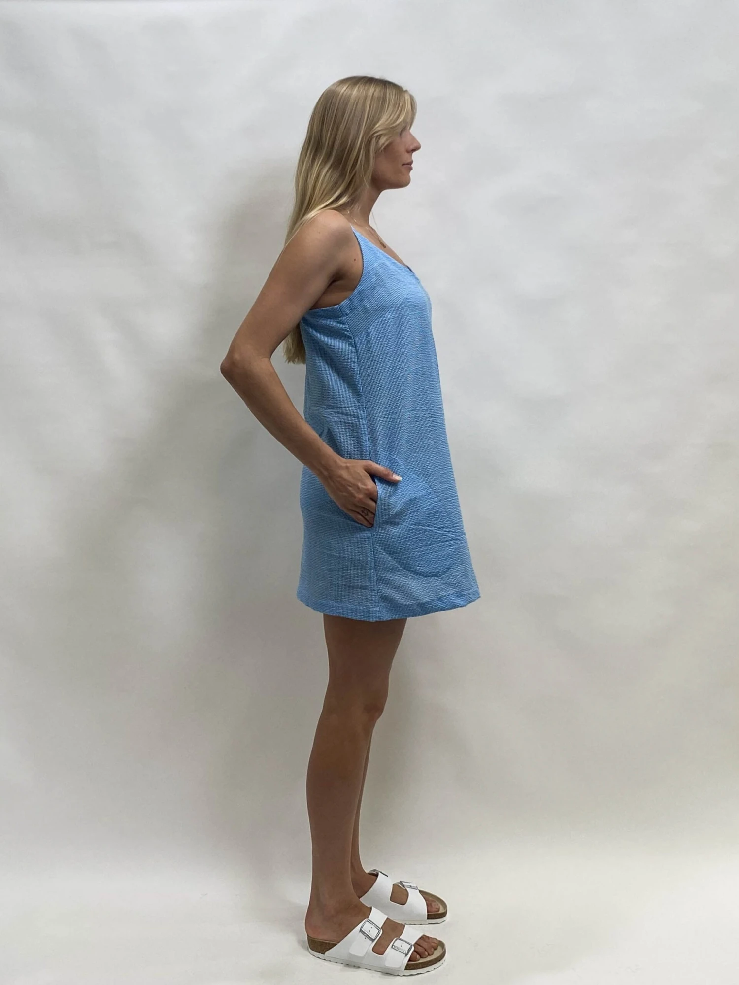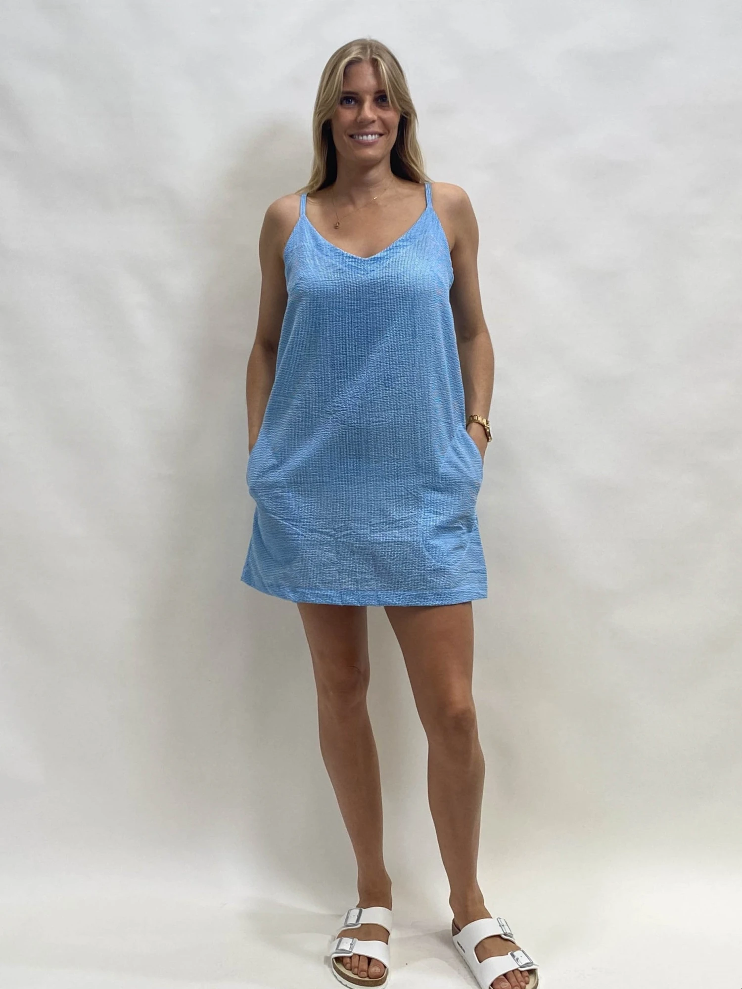 The zellsea linda-v neck dress the perfect slip dress with side pockets and shoe string straps. Slip on for a quick dash to the shops or for those warm summer days by the beach. Made from a small gorgeous check print in 100% cotton this will be your summer go to dress.Â