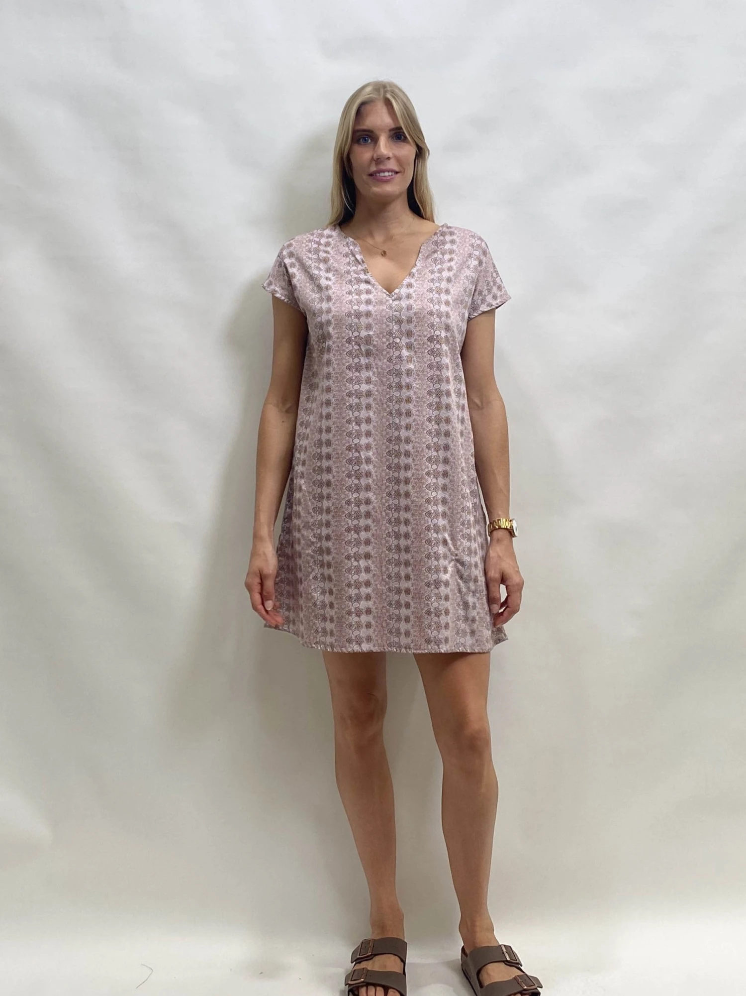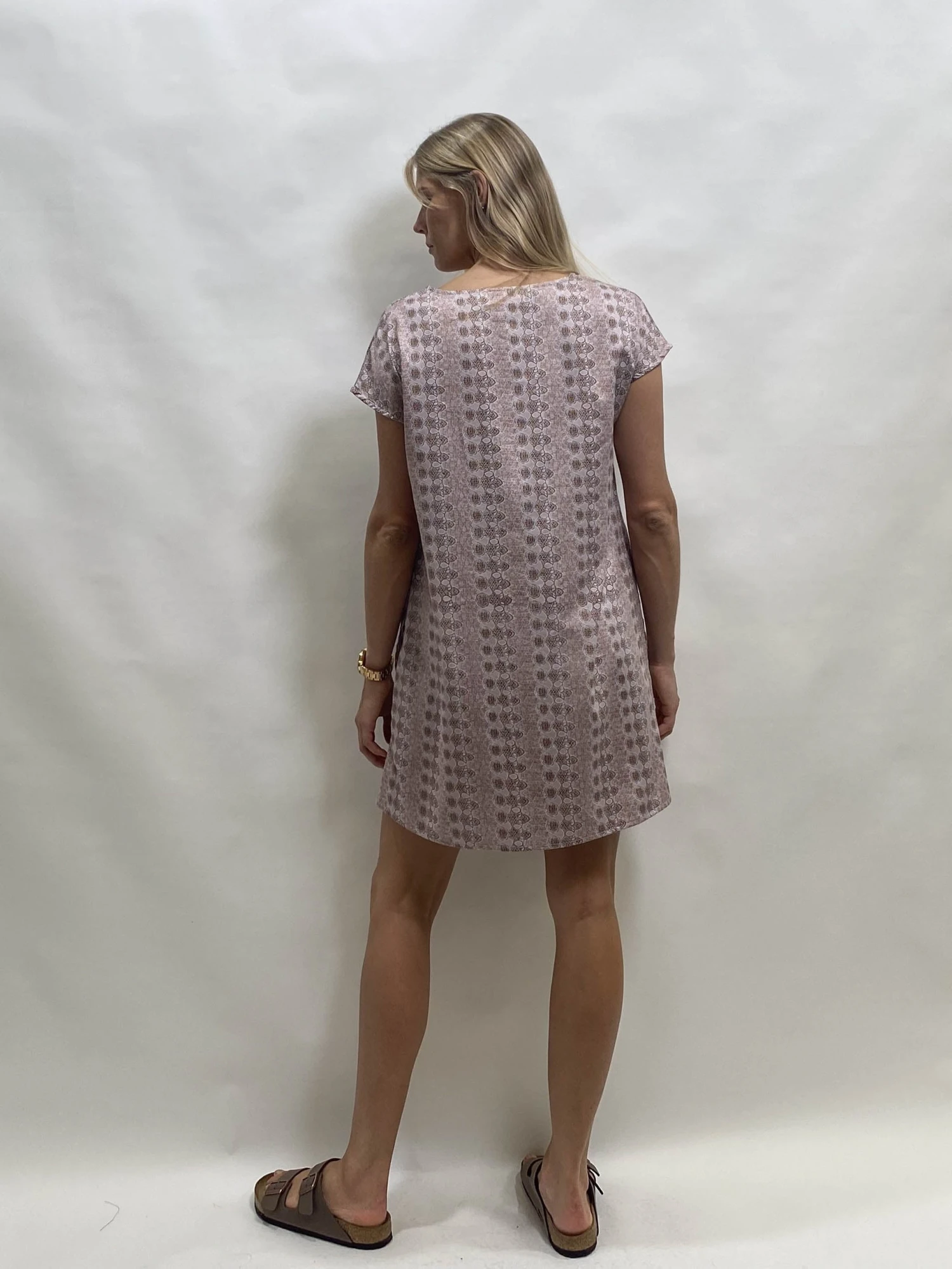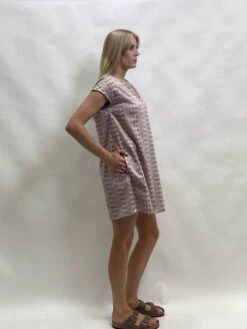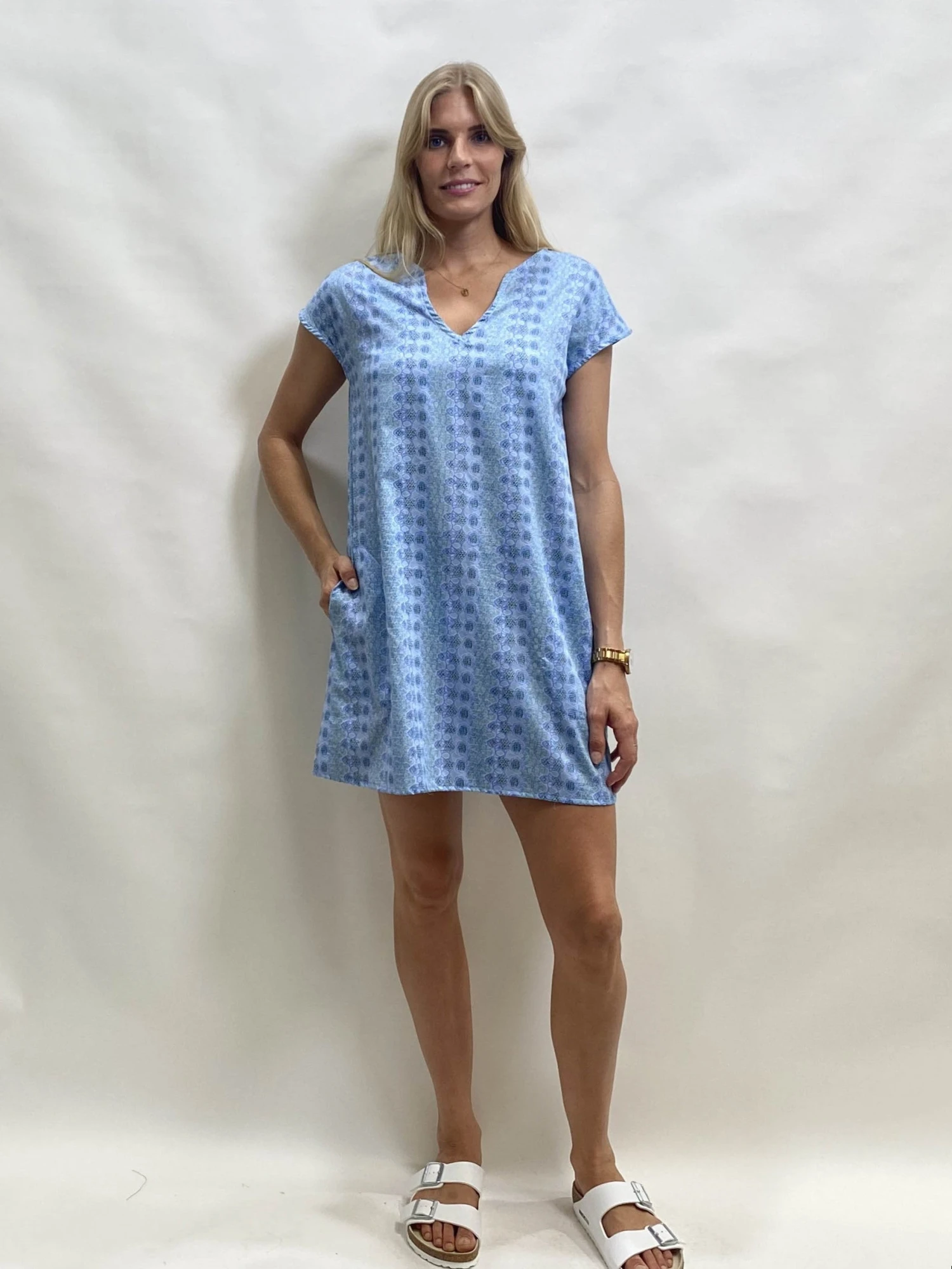 This comfortable sophia V-neck dress  is mindfully made featuring a subtle v-neckline and soft short sleeves. Finishing mid-thigh on you, this easy to slip on dress is a relaxed and loose, flattering fit. No zippers, buttons, ties or other irritants – just ultra-soft fabric crafted in a loose, relaxed fit for every occasion with side pockets.Â
